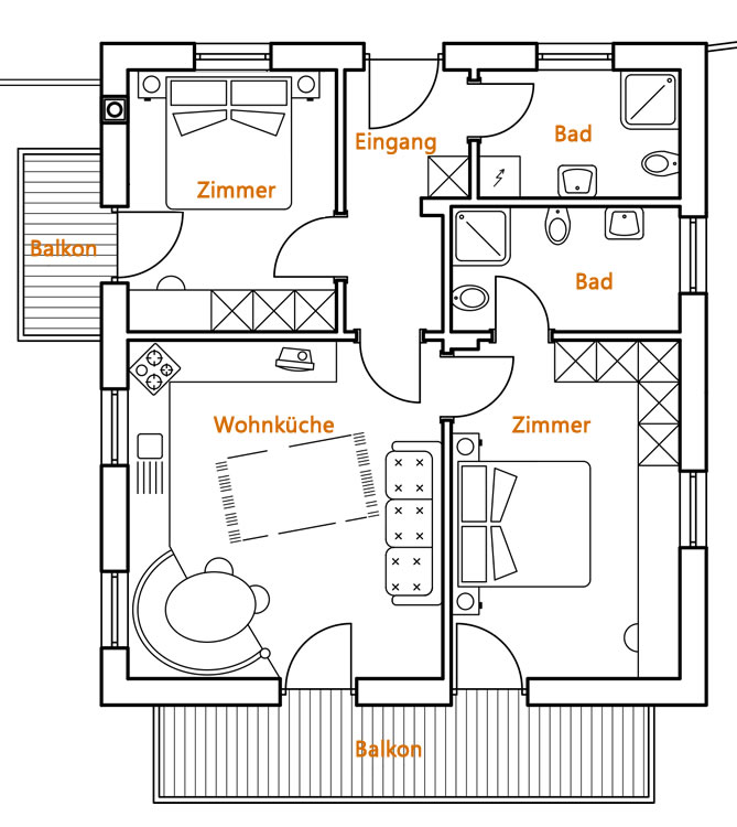 Piękne apartamenty w Castelrotto składają się z dwóch sypialni dwuosobowych z balkonem, dwóch łazienek i przestronnej kuchni połączonej z salonem z cudownym widokiem panoramicznym na Schlern. Na balkonie znajduje się stół z krzesłami i leżakami. W apartamentach dostępna jest telewizja satelitarn, bezpłatny Internet WiFi, w pełni wyposażona kuchnia z płytą ceramiczną, piekarnik, lodówka z zamrażalnikiem, ekspres do kawy i ekspres do mokki, pościel i ręczniki kąpielowe.